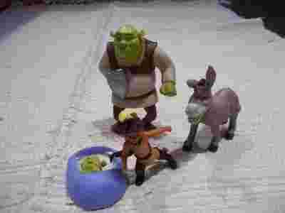 Shrek wys.12,5, gada po angielsku, beka, osiol wys.10,5, gada po angielsku, kot wys.ok.9cm.