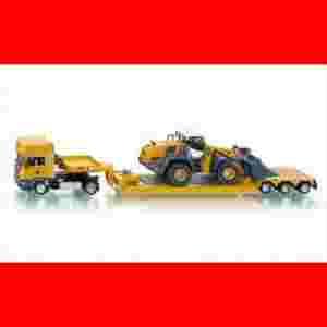 Zestaw zawiera metalowy model ciągnika siodÅ‚owego z platwormą, na której znajduje się Å‚adowarka..