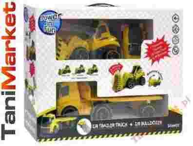Zestaw zawiera koperkę (buldożer) oraz lawetę oba pojazdy zdalnie sterowany za pomocą pilota I/R posiadające elementy dźwiękowe i świetne.