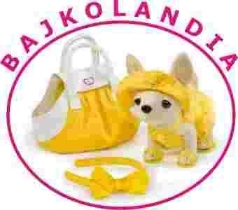 Pluszowy piesek chihuahua w stroju letnim, w sukience, klapkach, kapeluszu, w torbie, z opaską na włosy dla dziewczynki.