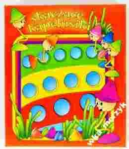 Zestaw składa się z planszy z okrągłymi otworami, 3 wyrzutni oraz kapelusików – w sumie 9 szt., po 3 szt. każdego koloru.