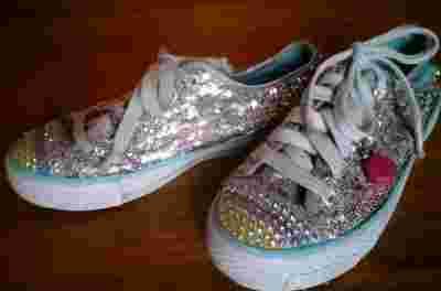 Tenisówki renomowanej firmy Skechers, srebrne wykonane z drobnych cekinów. Buty zawiązywane na sznurowadła, dziurki okute, gruba biała podeszwa, z przodu na palcach wykończenie gumą na której wybite są kolorowe dżety. Wnętrze materiałowe w kolorze turkusowym. U góry but wykończony srebrną lamówką. Przy okuciach sznurowadeł różowa róża na łańcuszku jedno z okuć.