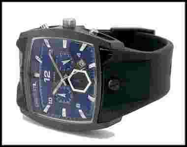 Zegarek dość sporych rozmiarów renomowanej marki Diesel. Wyposażony w nieszabloną tarczę. Stylistycznie nawiązuje do sportowych zegarków. Charakterystyczny wygląd z pewnością wyróżni Cię z tłumu. Koperta ze stali szlachetnej w kolorze czarnym o matowej fakturze. Granatowy cyferblat podkreślony srebrnymi indeksami, dzięki czemu odczyt godziny nie sprawia problemu. Dodatkowo wyposażony w precyzyjny chronograf oraz funkcjonalny datownik, dzień miesiąca. Wyraźnym akcentem czasomierza są ostre i kanciaste krawędzie. Pasek wykonany z tworzywa sztucznego koloru czarnego. Dzięki zastosowaniu najnowszych technologicznie materiałów, zegarek jest lekki, wytrzymały, miły w dotyku oraz dobrze leży na nadgarstku. Posiada podwyższony współczynnik wodoszczelności. Zapakowany w białe pudełeczko.