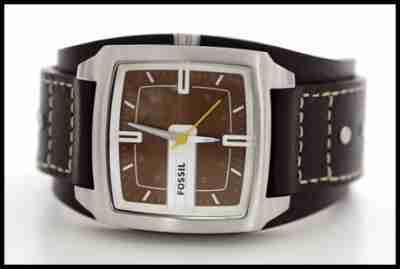 Śmiały, sexy i bardzo męski. Bezkresny, prawdziwy zespół szerokiego paska skórzanego z akcentami dużej klamry. Pasek wykonany z brązowej, mięciutkiej skórki o fakturze lekko marszczonej. Przeszyty grubymi nićmi, dzięki czemu zyskuje wyrazisty charakter. Kwadratowa, matowa koperta ze stali szlachetnej szczotkowanej. Regulowane, metalowe zapięcie paska (logo FOSSIL). Na godzinie dziewiątej (9:00) znajduje się logo firmy FOSSIL. Srebrne wskazówki - lśniące w ciemności. Cyferblat w przewadze koloru brązowego z białymi indeksami godzinnymi. Mocnym akcentem jest kontrastujący sekundnik koloru żółtego. Pełna dokumentacja. Zapakowany w unikatową puszeczkę FOSSIL.