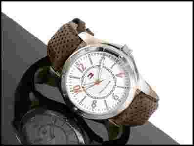 Elegancji zegarek marki TOMMY HILFIGER z najnowszej kolekcji. Pasek wykonany z mięciutkiej skóry koloru brązowego o dziurkowanej fakturze. Zabieg ten z pewnością podkreśli wyrazistość tego zegarka. Koperta oraz zapięcie paska ze srebrnej stali szlachetnej. Całość w fakturze pełnego połysku. Skład materiałowy nie zawiera domieszek metali uczulających tj. chromu i niklu. Bogato zdobiony cyferblat. Pomarańczowe indeksy godzinne wraz z arabskimi oznaczeniami tworzą idealne połączenie. Tarcza zawiera charakterystyczne logo firmy TH. Połączenie kolorów sprawia, iż odczyt godziny nie stanowi problemu. Zewnętrzną część koperty zdobi srebrny pierścień z grawerką nazwy firmy T.H. Pokrętło czasomierza dyskretnie schowane w obudowie koperty. Idealny prezent dla ukochanej osoby. Pełna dokumentacja. Zapakowany w unikatowe opakowanie TOMMY.