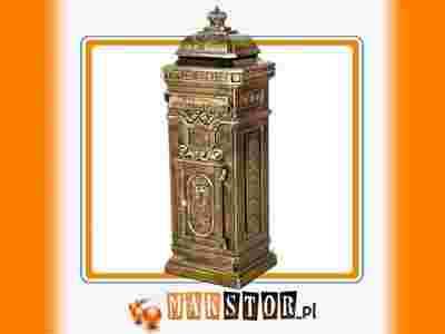 Posiada zdobienia ze wszystkich stron. Wykonana z odlewanego aluminium a więc jest niezwykle wytrzymała jak i odporna na rdzę. Przystosowana na przesyłki formatu A4 gazety i czasopisma. Wewnętrzna pojemność wynosi aż 0,15 m³. Przeznaczona jest dla wszystkich miłośników stylu antycznego oraz tych którzy pragną nadać swojemu otoczeniu niepowtarzalny wygląd i charakter. Zamykana na zamek (dwa kluczyki w komplecie). Produkt charakteryzuje się wysoką dbałością o detale i solidnością.