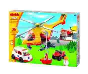 W zestawie znajdują się 4 figurki ( pielęgniarka, lekarz, ratownik, poszkodowany), helikopter, skuter, kosz na rannego.