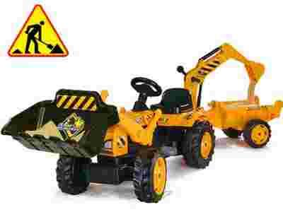 Traktor Max na pedały z wygodnym siedzeniem, przyczepką, koparką oraz możliwością funkcji spychacza i ładowarki to zabawka, o której marzy każdy chłopak.