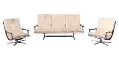 Modernistyczny zestaw składający się z trzyosobowej sofy oraz dwóch foteli o organicznym kształcie. Boki z podłokietnikami wykonane zostały z drewna bukowego barwionego na ciemny orzech. Postawy metalowe, fotele na obrotowym krzyżaku. Rzadko spotykany cały komplet. Oryginalna tapicerka do zmiany.