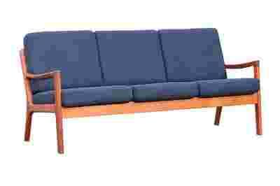 Sofa projektu Ole Wanschera z 1951 roku, model SENATOR. Produkcja CADO Denmark. Konstrukcja drewna tekowego. Sofa tapicerowana nową, mocna tkaniną w granatowym kolorze - bardzo dobrej jakości mieszanka wełny. Mebel po pełnej renowacji gotowy do użytkowania.