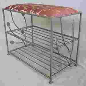 Model sofki - VERA Sofka Ławka tapicerowana z półkami na buty Przykład : sofka - tkanina żakard A, stelaż- stare złoto