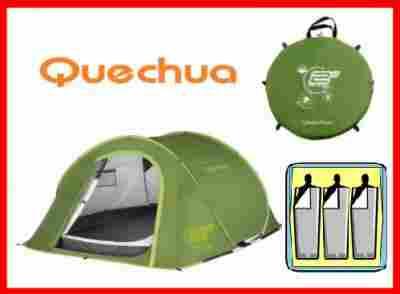 • Błyskawiczne rozkładanie. Namiot samonośny (po rozłożeniu możecie go ustawić, gdzie zechcecie, a  przy braku wiatru nie trzeba go przymocowywać szpilą= można bezpośrednio używać!) W komplecie w razie potrzeby 11 szpil i 5 linek. Składany w 15 sekund (w kilku prostych ruchach według instrukcji zamieszczonej na stronie www.quechua.com).