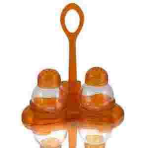 Solniczka i pieprzniczka z serii Vicenza, w komplecie z tacką i nosidełkiem. Pojemniki wykonane ze szkła, nakrętki i tacka z plastiku.