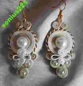 Do wykonania kolczyków użyto między innymi:sutasz czeskiej firmy Pega w kolorach ecru,biały i ciut złotego oraz perły duże seashelle i małe akrylowe.