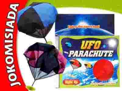 Fajna, nietuzinkowa zabawka dla chłopców i dziewczyn. Spadochron z świecącym talerzem/dyskiem jest niezłym pomysłem na spędzenie wesoło czasu. Czasza spadochronu wykonana jest z kolorowego materiału, na którego końcu umocowany jest świecący spodek. Zabawa polega na zrzucaniu spadochronu z góry na dół, lub poprostu można go podrzucić do góry i obserwować jak spada w dół. Efektu dodaje świecący spodek. Zabawka zmusza do ruszania, biegania, skakania, świetna do zabawy na zewnątrz jak i w domu.