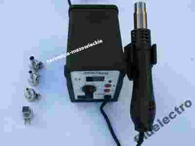 Stacja na gorące powietrze, służąca do wylutowywania i wlutowywania układów elektronicznych np. BGA, SMD i itd. oraz stacja lutownicza grotowa o mocy 60W. Stacja posiada wbudowane dwa wyświetlacze LED informujący o nastawionej temperaturze gorącego powietrza . Stacja posiada również regulacje siły nadmuchu Hotair.