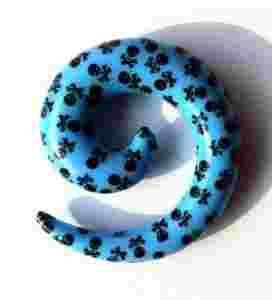Przedmiotem sprzedaży jest rozpychacz spirala grubości 8mm NIEBIESKA W CZARNE CZASZKI. Spirala jest wykonana z akrylu. Grubość spirali 8mm, wysokość 32mm, szerokość 28mm.