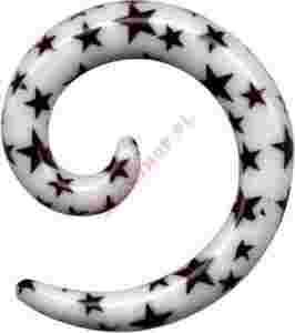 Przedmiotem aukcji jest kolczyk do ucha spirala akrylowa biała z czarnymi gwiazdkami.