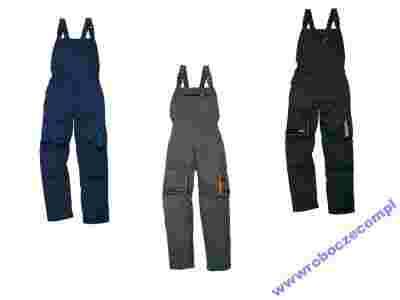 Ogrodniczki robocze Mach2 z poliestru 65% i bawełny 35%. Gumka w talii. Szeroka kieszeń centralna zapinana na zamek błyskawiczny. Miejsca na nakolanniki. 8 kieszeni.