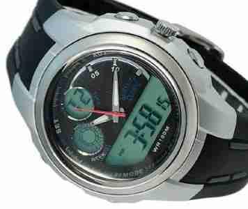 Tarcza elektroniczna i analogowa: Zegarek wyświetla: godzinę, minuty, sekundy, datę, i dzień tygodnia.