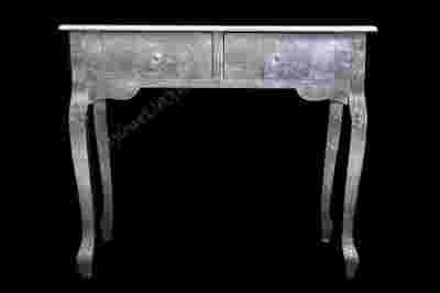 Konsolka wykonana z drewna egzotycznego barwionego na kolor srebrny z połyskiem.