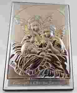 Obrazek wykonany ze srebra, wzmocniony blachą aluminiową. Srebro zabezpieczone przed działaniem czynników atmosferycznych. Tył obrazka wykonany jest z najwyższej jakości drewna. Obrazek można powiesić na ścianie lub postawić np. na półce. Wspaniały prezent na komunię, chrzest, rocznicę.