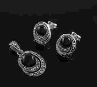 SREBRNY WISIOR I KOLCZYKI KAMIEŃ ONYKS I MARKAZYTY