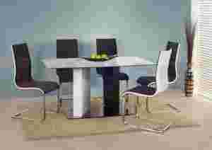 Stelaż stołu wykonany z MDF lakierowany na wysoki połysk w kolorze biało/czarnym, blat to hartowane białe lub czarne szkło 8 mm odporne na zarysowania. Dzięki takiemu połączeniu materiałów łatwo utrzymasz meble w czystości. Przy stole swobodnie siada sześć osób.