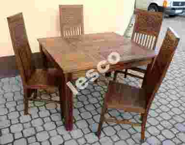 Przepiekny komplet wykonany przez naszych stolarzy z ponad 150 - letniego recyklowanego (??? ang. recycled teak) drewna tekowego. Brzmi to trochę jak współcześnie robiony ANTYK. Wykonczyliśmy go piaskując tekowe drewno przez co dostało ono bardzo ciekawej struktury, oparcia krzeseł po ręcznym rzeźbieniu polakierowaliśmy chemoutwardzalnym półmatowym lakierem bezbarwnym. Ułatwia to pielegnacje mebla (wystarczy przemyć wilgotna szmatka z detergentem) oraz zabezpieczenie powierzchni przed osadzaniem sie kurzu, brudzeniem, krążkami od filiżanek kawy, etc..
