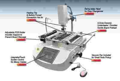 Duże grzałki MANNCORP BR610 używają promieni IR do łagodnego podgrzewania spodniej częci płyty, podczas gdy strumień gorącego powietrza od spodu wspomaga proces topienia kul pod układami BGA.