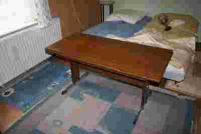 stary stół - ława rozkładana, z czasów PRL. Zabrudzenia i kurz. Rysy na wysuwanej części blatu, druga strona o wiele ładniejsza