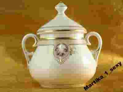 bardzo starą cukiernicę wykonaną z porcelany grubościennej.Ozdobiona bardzo efektownym girlandem kwiatowym a całość podkreślona została cudownymi uszkami .Na szczególną uwagę zasługuje forma.Artykuł posiada sygnaturę cyfrową -sądząc po fasonie i motywie zdobniczym najprawdopodobniej KPM(Wałbrzych).Polecamy szczególnie kolekcjonerom starej porcelany.