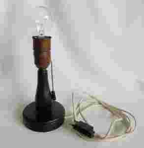 Podstawa lampki jest drewniana, oprawka mosiężna z elementem ceramicznym