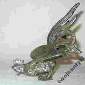 Figura ma swoją słuszną masę, wykonana została najprawdopodobniej z mosiądzu srebrzonego, a chciałabym podkreślić, że jest to ręcznie wykonana rzecz, a praca w tak twardym materiale i tworzenie z niego takich cudownych rzeczy wymaga naprawdę sporego talentu, kunsztu i rzecz jasna sporych umiejętności. Zatem tym bardziej trzeba docenić urodę proponowanej w tej aukcji rzeźby. Przedstawia ona kogut gotowego do ataku, do walki na śmierć i życie. Przepiękne i dostojne ptaszysko o imponujących szeroko rozpostartych skrzydłach. Zwróć uwagę na wspaniałą linię tego ”osobnika”, na charakterystyczną budowę, krótką szyję, kształtną głowę z klasycznym grzebieniem , typowe skrzydła i nad wyraz przepięknie ukształtowany ogon. Nawet faktura piór została tu realistycznie i pieczołowicie oddana, tak dokładnie, że zdawać by się mogło, iż jest ich bardzo dużo są miękkie.