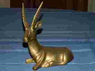 Przedmiotem aukcji jest stara, masywna, przepiękna rzeźba. Przedmiot zachowany jest doskonałym stanie, wspaniale, naturalnie spatynowany, co podkreśla dodatkowo jego dostojną wiekowość. Figura ma swoją słuszną masę, wykonana została bowiem w mosiądzu. Mosiądz przez lata pociemniał, stąd interesujący kolor rzeźby. Chciałbym podkreślić, że to nie jest pusty odlew tylko ręcznie rzeźbiona figura, a praca w tak twardym materiale i tworzenie z niego takich cudownych rzeczy wymaga naprawdę sporego talentu i rzecz jasna umiejętności.Rzeźba przedstawia leżącego kozła z potężnymi rogami. Proszę zwrócić uwagę na wspaniałą linię tego zwierzęcia, masywna budowa ciała oraz potężne poroże które jest wspaniałe i pieczołowicie odwzorowane co niewątpliwie dodaje całości uroku. Jak już wspomniałem rzeźba zachowana jest w doskonałym stanie. Idealnie podkreśli klimat i charakter każdego biura, czy salonu. To także niewątpliwie wspaniały okaz do kolekcji mosiężnych bibelotów.