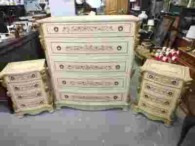 Na zestaw składają się 3 komody: jedna duża i dwie małe, mogące służyć jako stoliki nocne.