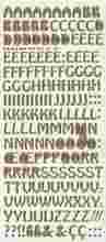 Duże litery, wymiar ok 1,0x0,5cm. Każda litera występuje od5-8x na arkuszu, dodatkowo znaki interpunkcyjne.