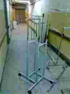 Stelaż metalowy, malowany proszkowo na kolor szary, wieszaki na ubrania wysuwane do góry, chromowane. Płynna regulacja wysokości.
