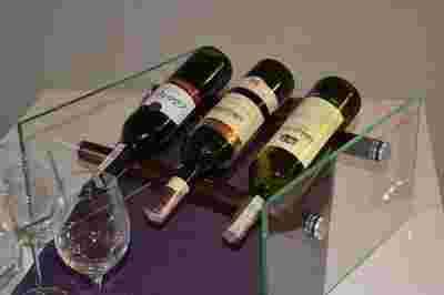 Stojak na butelki wina, szklany z dodatkiem drewna szlachetnego.