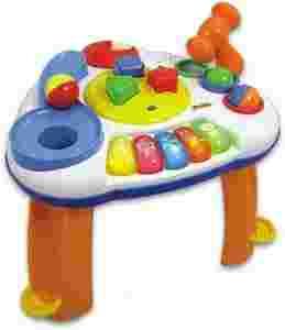 Stolik ćwiczy sprawność manualną rąk. Uczy koncentracji. Zachęca do aktywnej zabawy. Uczy dzieci zręczności oraz logicznego myślenia.Każde wbicie piłeczki do otworów w stoliczku, lub odpowiednie dopasowanie klocków do otworów z rysunkami instrumentów, zostaje nagrodzone: stół wydaje zabawne dźwięki, gra melodyjki i miga świecącymi klawiszami. Stoliczkiem może się dzidziuś również bawić, bez zamontowywania nóżek. Ma śliczne żywe kolory. Wykonany jest z wysokiej jakości plastiku.