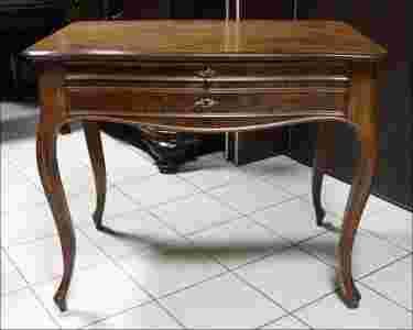 Stolik bądź niewielkie biurko z drugiej połowy XIX wieku. Mebel orzechowy, o ciepłych kształtach. Gięte linie nóg, blatu oraz szuflady, front mebla zdobiony czeczotą orzechową. Oprócz płytkiej szuflady, pod blatem udało się jeszcze zmieścić dodatkowy wysuwany blat wyłożony ciemno brązową skórą - zarówno on jak i szuflada zamykane są na klucz.