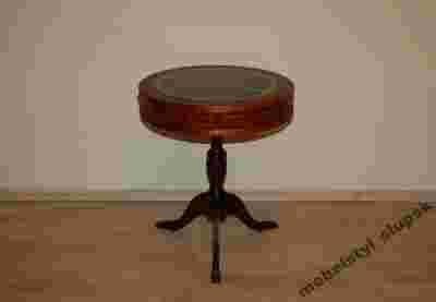Blat stolika pokryty zieloną skórą.