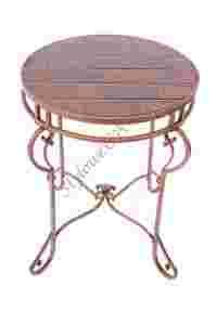 Blat z drewna egzotycznego, w kolorze brązowym.Podstwa stolika wykonana została z metalu.