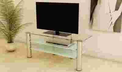 Nowoczesny stolik RTV wykonany ze szkła hatrowanego szlifowaneg, polerowanego.