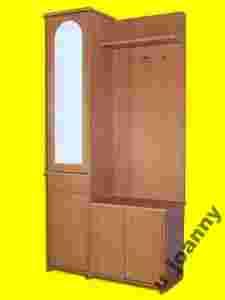 Garderoba wykonana z wysokiej jakości płyty laminowanej o grubości 18mm w kolorze olcha. Krawędzie garderoby wykończone miękką okleiną PCV w kolorze laminatu. Garderoba posiada w części dolnej dwie szafki w każdej znajduje się półka. Znajduje się również szuflada. W części wyższej za drzwiczkami z lustrem znajdują się dwie półki. Garderoba w części wyższej posiada również zamontowane trzy podwójne metalowe haczyki w kolorze chromu. Posiada również zamontowaną półkę. Uchwyty szafek i szuflady plastykowe w kolorze satynowym z wypełnieniem w kolorze laminatu. Garderoba stoi na plastykowych ślizgaczach.