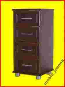Komoda wykona z wysokiej jakości płyty laminowanej o grubości 18 mm w kolorze Ciemny orzech. Krawędzie w większości wykończone mocną okleiną PCV. Komoda posiada trzy szuflady osadzone na metalowych prowadnicach rolkowych. Front szuflad ramkowy wykonany w technologii płycinowej. Uchwyty szuflad plastykowe w kolorze satynowym. Komoda stoi na plastykowych satynowych stopkach o wysokości 5 cm.