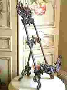 Niespotykany przedmiot, wysoka, metalowa, stylowa sztaluga do prezentacji obrazów.