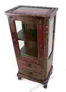 Witryna wykonana z litego drewna egzotycznego, w kolorze ciemnobrązowym o odcieniu Mahoniowym.