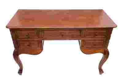 Biurko wykonane z wysokiej jakości litego drewna egzotycznego, w kolorze brązowym (dębowym). Pięknie zdobione ornamentami o motywach roślinnych. Wyposażone w pięć pojemnych szuflad. Piękny i praktyczny mebel.
