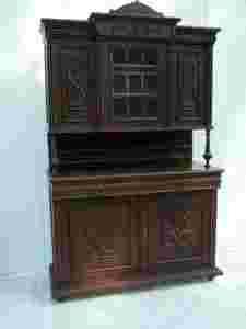 Kredens jest bogato zdobiony co nadaje mu unikalny wygląd . Składa się z dwóch integralnych części połączonych stylowym balkonikiem z tralkami. Dolna częśc to komoda składająca się z pojemnej szafki oraz dwóch szuflad. Górna natomiast to witryna składająca sie z trzech szafek . Środkowe drzwiczki są oszklone pięknym kryształowym szkłem. Stan mebla bardzo dobry - normalne ślady użytkowania!!!